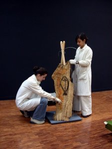 Catarina Teixeira (esquerda) e Mariana Duarte (direita) durante a montagem da exposição “Com os índios Wauja” colocando uma máscara no suporte