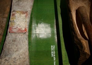 Pormenor da degradação (mancha branca sobre o estrado verde) causada pelo tombo do objecto provocado por um visitante