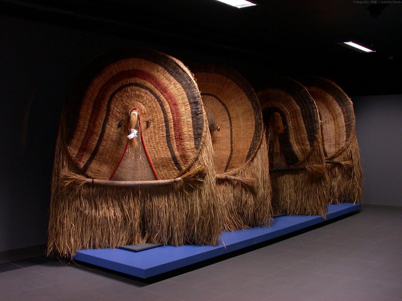 Vista geral de quatro máscaras Wauja de grandes dimensões sobre estrado