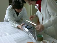 Joana Amaral (esquerda) e Catarina Teixeira (direita) preparando a bolsa de Xamã BB.754 para desinfestação por exposição a baixas temperaturas