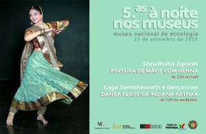 Na próxima 5.ª feira à noite, no dia 23 de Setembro, o auditório do Museu Nacional de Etnologia recebe um espectáculo de dança clássica indiana Kathak, protagonizado por Lajja Sambhavnath acompanhada por um grupo de dançarinas (da Comunidade Hindu de Portugal).