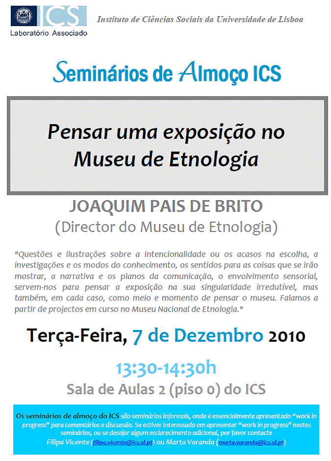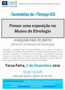 SEMINÁRIOS DE ALMOÇO no ICS | 7 de Dez, às 13h30 Posted on Dezembro 6, 2010 by mnetnologia SEMINÁRIOS DE ALMOÇO no ICS 7 de Dez, às 13h30 “Pensar um exposição no Museu Nacional de Etnologia”, por Joaquim Pais de Brito. Partilhar | Share this: Clique para partilhar no Facebook (Abre numa nova janela) Facebook Click to share on X (Abre numa nova janela) X Carregue aqui para enviar por email a um amigo (Abre numa nova janela) E-mail Gosto Carregando... Relacionado