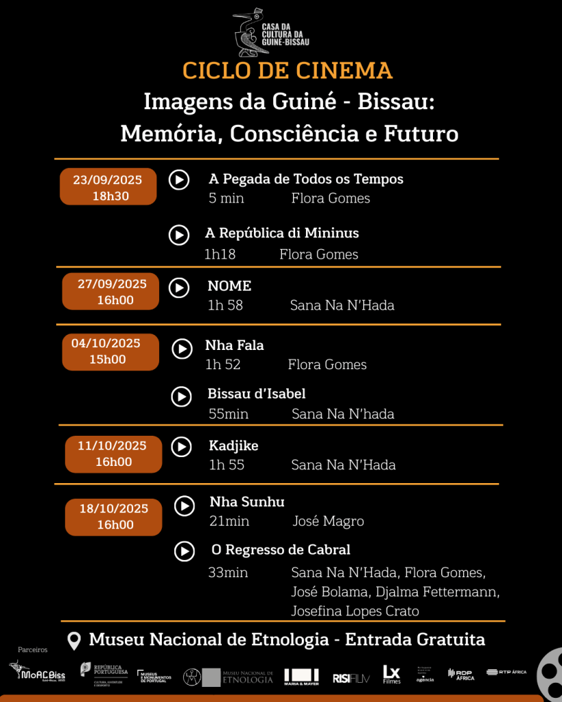 De 23 de setembro a 18 de outubro, o Museu Nacional de Etnologia recebe, em parceria com a Casa da Cultura da Guiné-Bissau, o Ciclo de Cinema “Imagens da Guiné-Bissau: Memória, Consciência e Futuro” com uma seleção de filmes que refletem essencialmente sobre a História da Guiné Bissau. A seleção de filmes teve a curadoria de Onésio Soda e Welket Bungé e inclui filmes realizados por Flora Gomes, Sana Na N’Hada, José Magro, José Bolama, Djalma Fettermann e Josefina Lopes Crato.