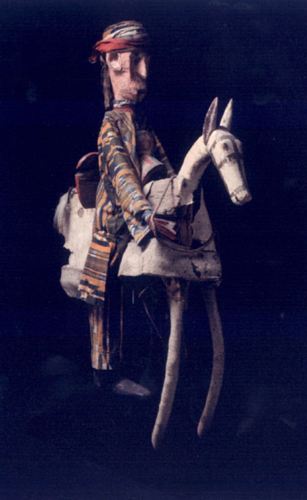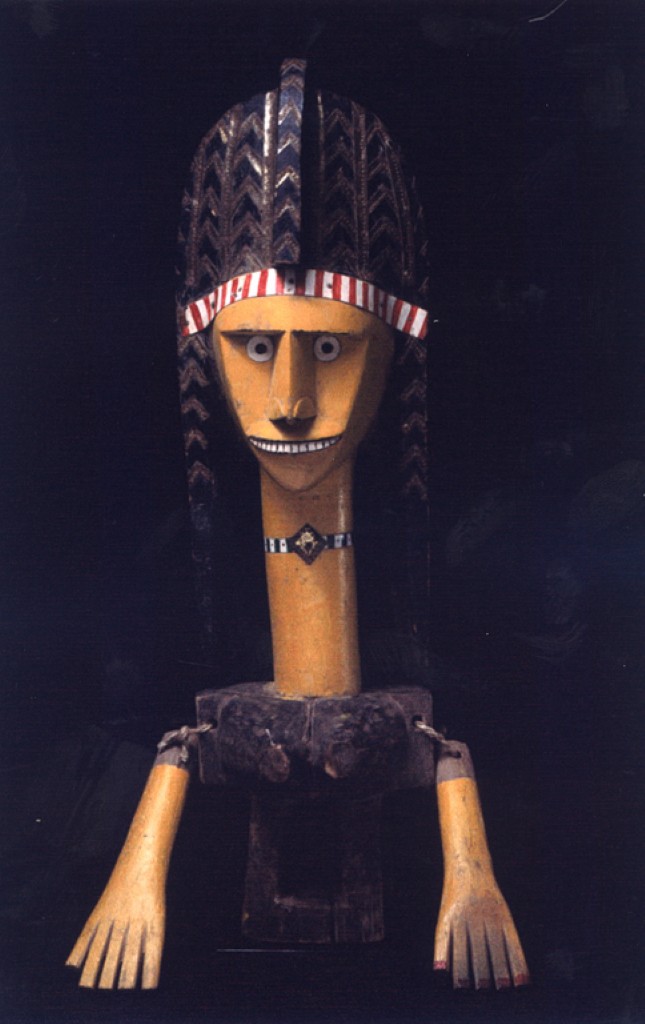 2) Uma segunda categoria de marionetas de madeira consiste numa grande cabeça e torso, esculpidos, que emerge de uma armadura de madeira, vestida, e que representa o corpo do personagem. As marionetas deste tipo são quase sempre representações de personagens humanas. Os braços da personagem são, regra geral, esculpidos separadamente e o dançarino/ bonecreiro, que está escondido dentro do corpo trajado, manipula os braços para animar a figura. Este segundo tipo é mais raro no inventário das trupes, ao contrário das cabeças de animais que são muito frequentes.
