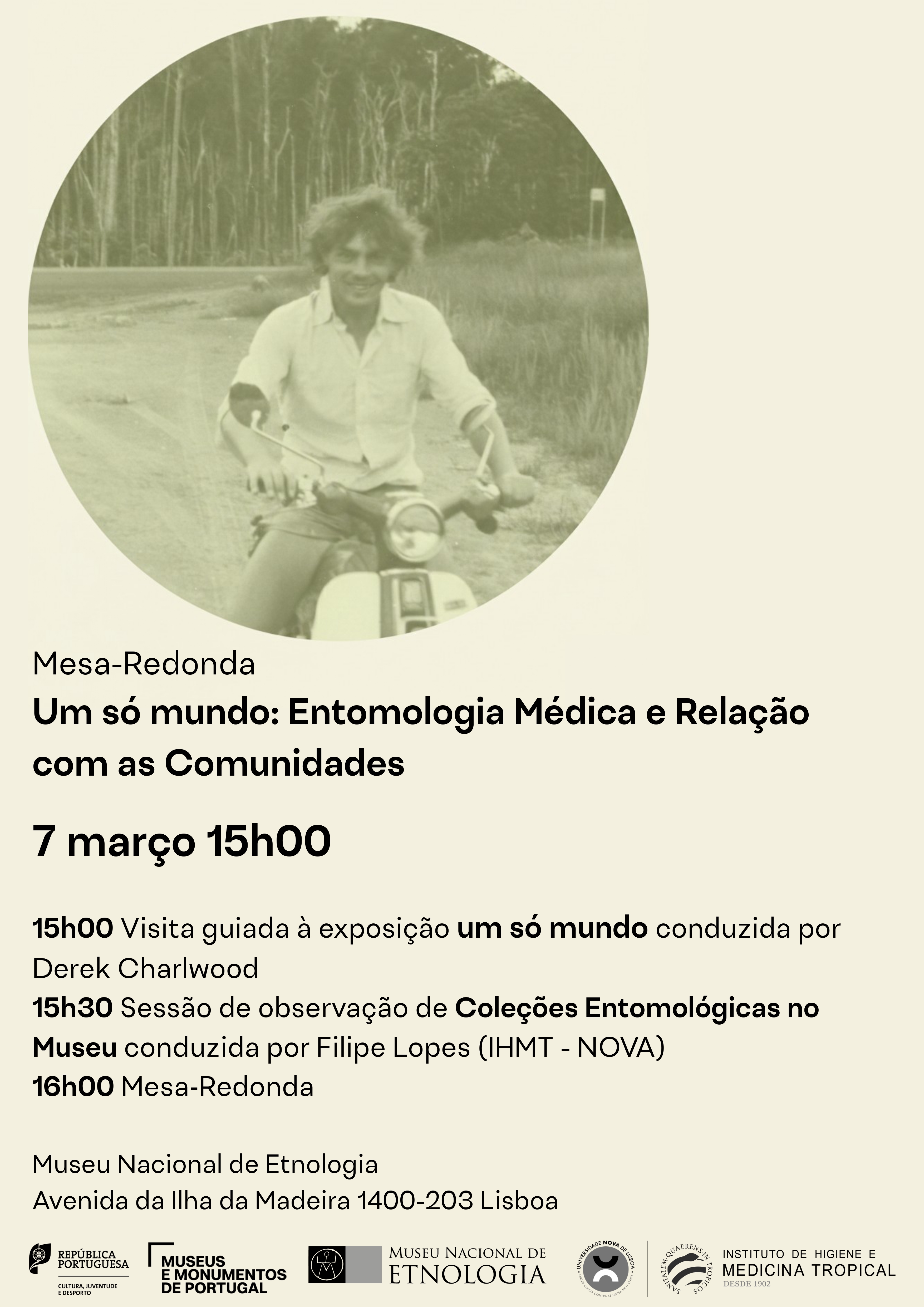 A Mesa-Redonda Um só mundo: Entomologia Médica e Relação com as Comunidades terá como oradores João Pinto (IHMT/UNL) Derek Charlwood (co-curador da exposição) e será moderada por Sofia Rodrigues (IHMT/UNL)