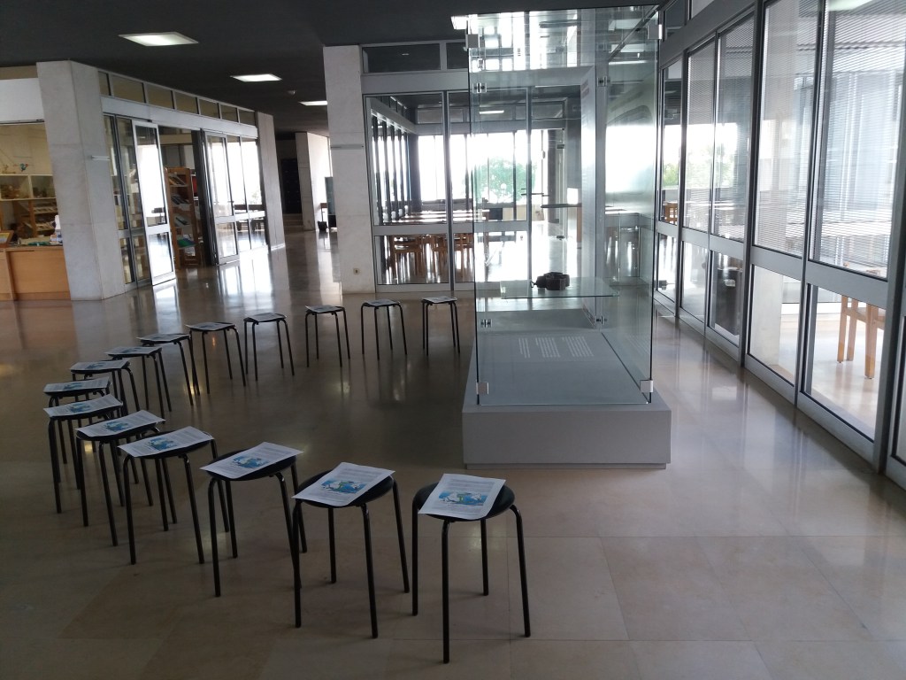 Observação silenciosa da peça dos Testemunhos da Escravatura. Visualização do doc. entregue sobre o Tráfico Negreiro.