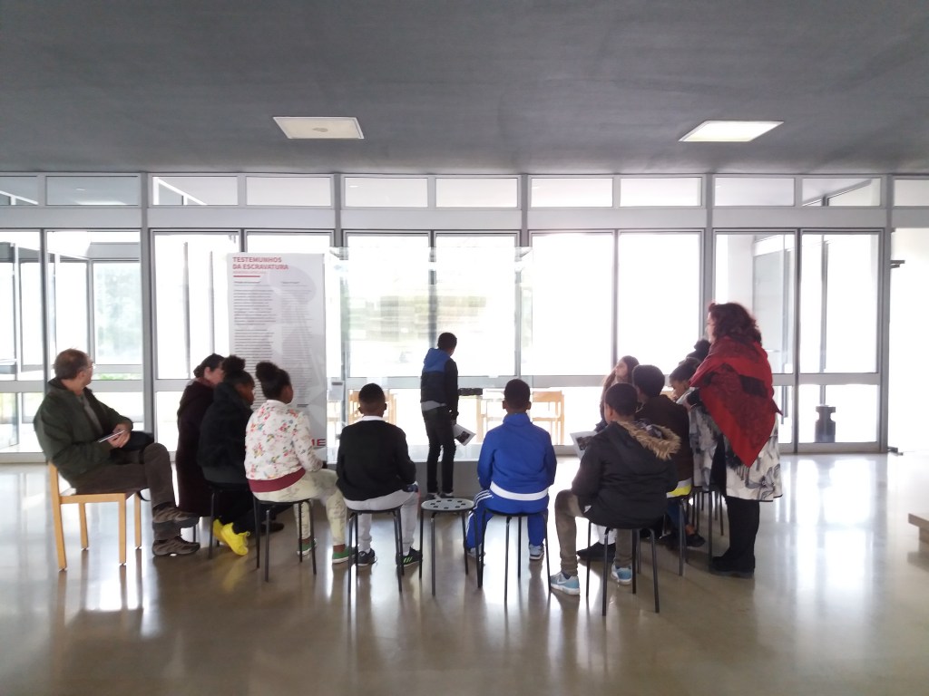 Observação silenciosa da peça dos Testemunhos da Escravatura. Visualização do doc. entregue sobre o Tráfico Negreiro.