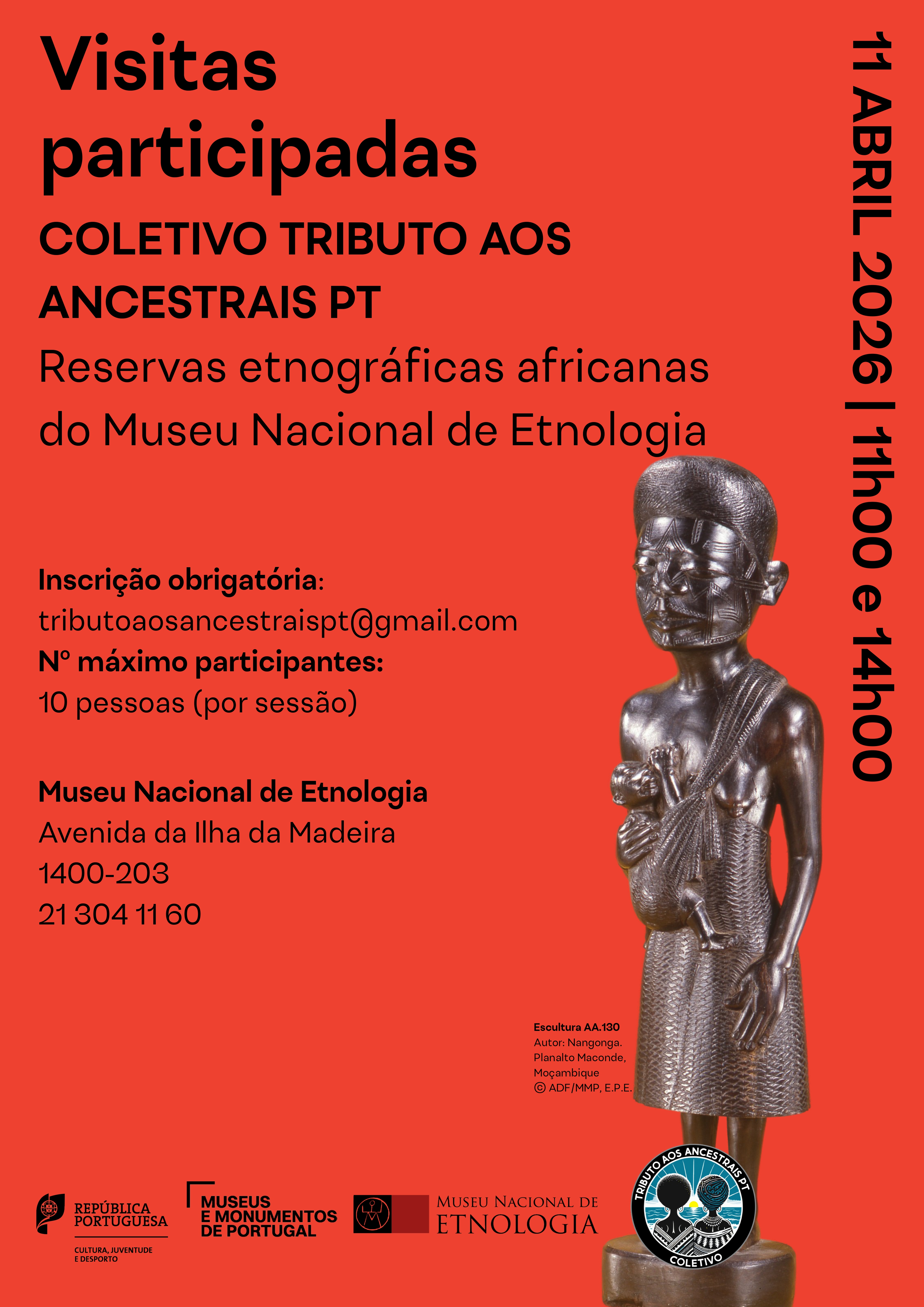 O Coletivo Tributo aos Ancestrais PT, em parceria com o Museu Nacional de Etnologia (MNE), em Belém, Lisboa, tem a honra de convidá-lo(a) a participar nas visitas participadas às reservas etnográficas africanas do Museu. As sessões ocorrem nos segundos sábados de cada mês, às 11h00 e 14h00, tendo uma duração aproximada de uma hora e trinta minutos.